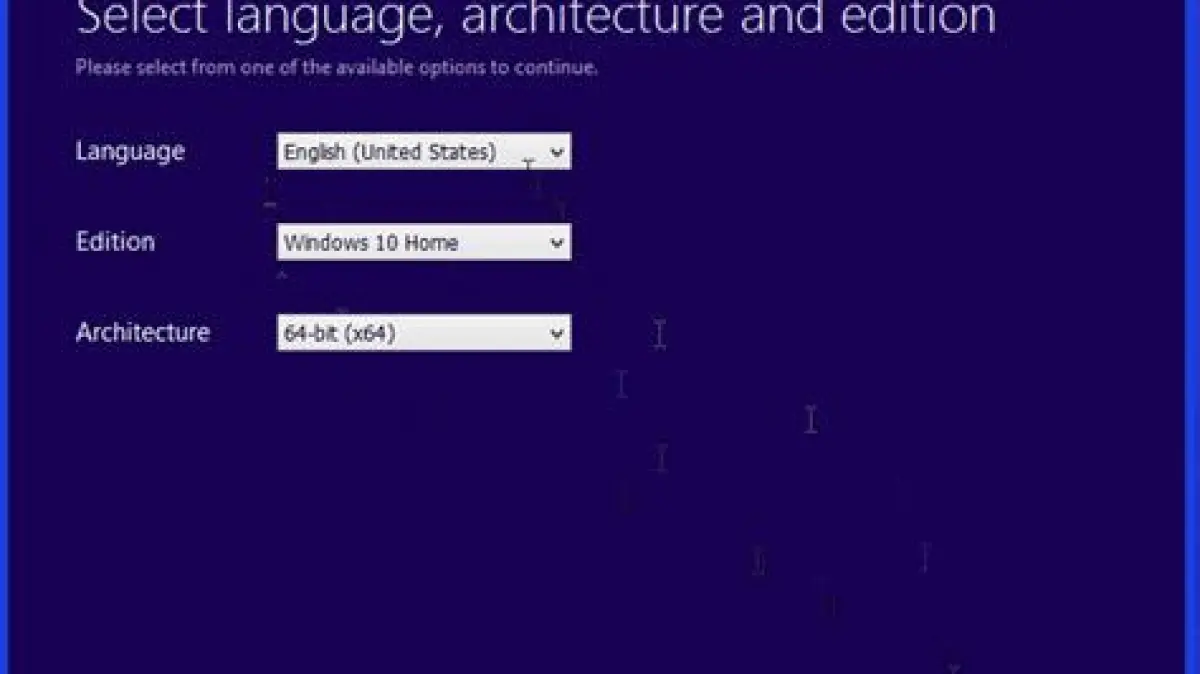 - Pilih bahasa, edisi (Windows 10), dan arsitektur (64-bit disarankan untuk komputer modern).