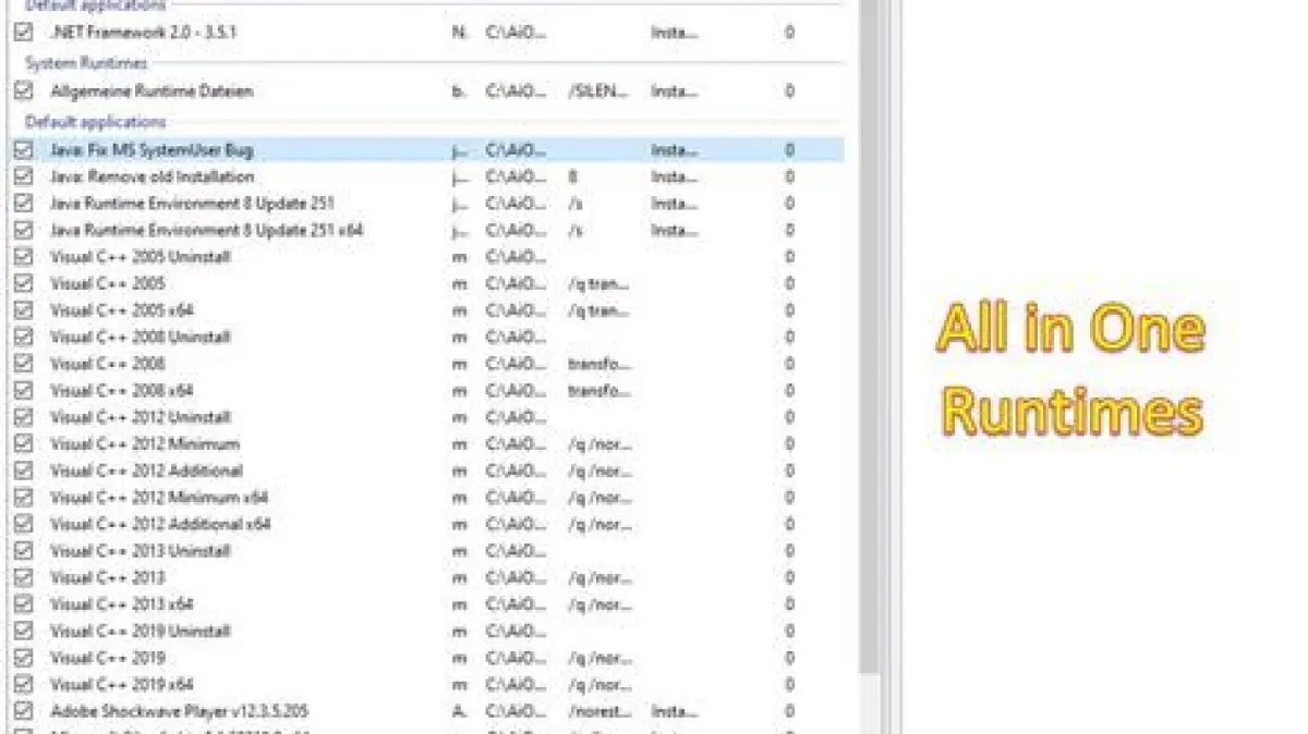 Sederhananya, Runtime AIO adalah bundel yang berisi berbagai macam runtime libraries yang dibutuhkan oleh aplikasi Windows. Beberapa yang umum di antaranya adalah: